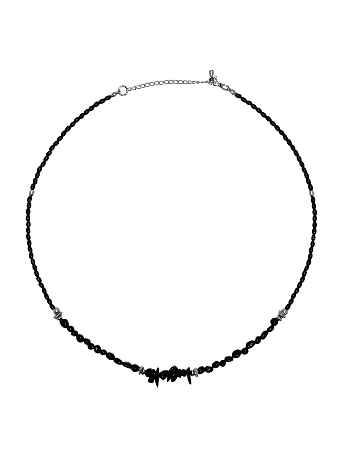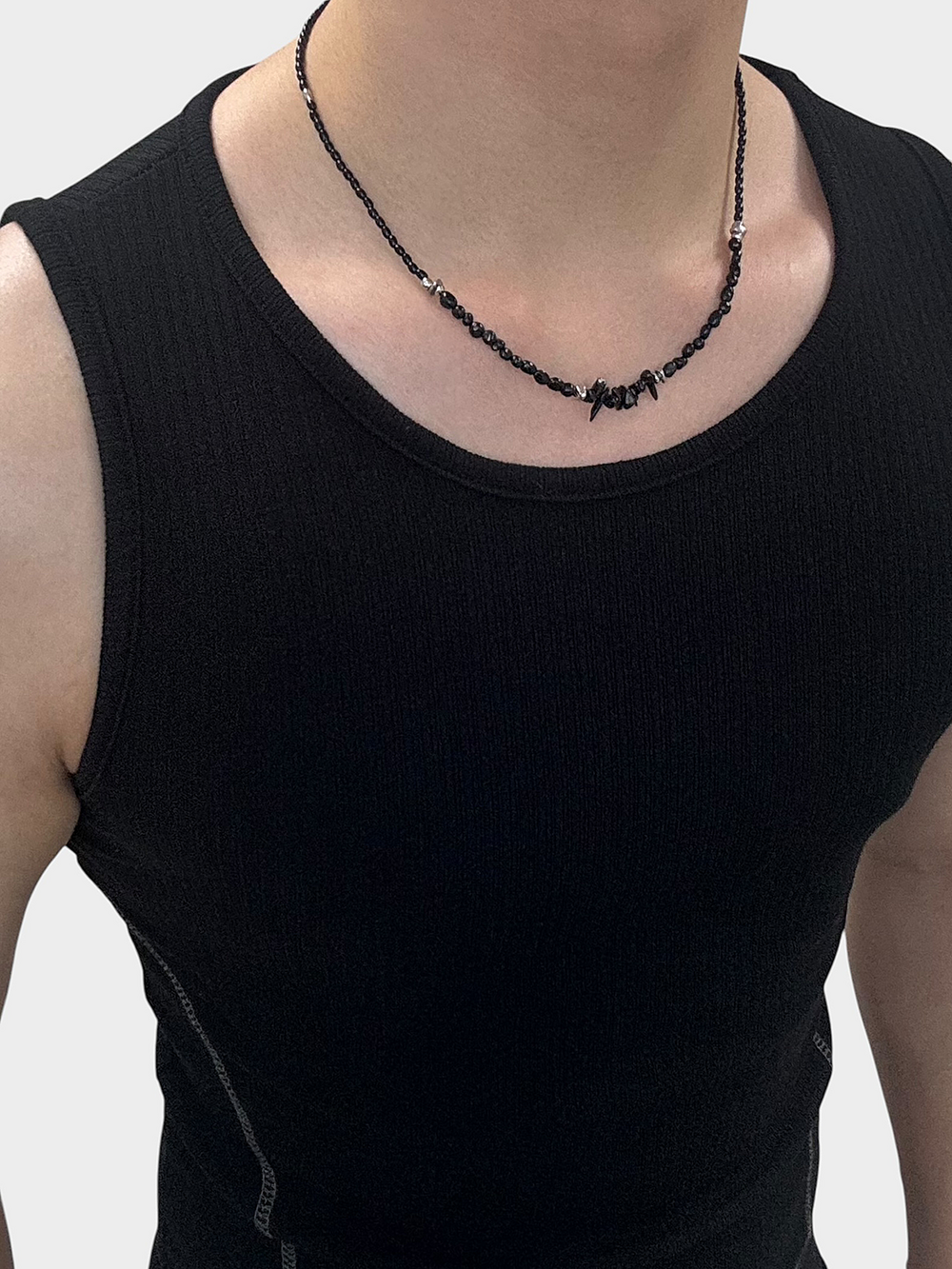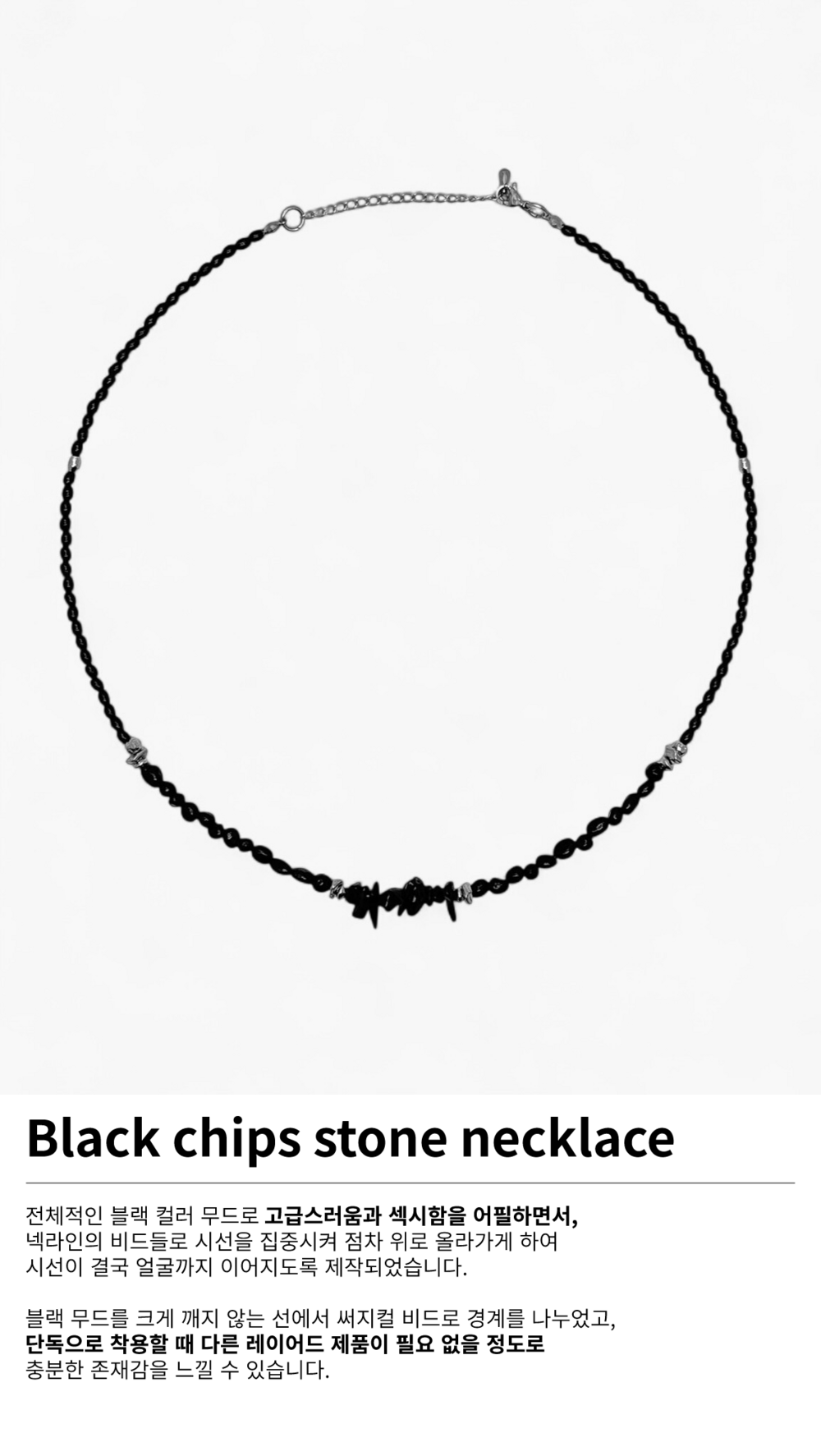 오닉스와 칩스 비드가 넥라인에서 중심을 잡는 포인트를 줍니다.