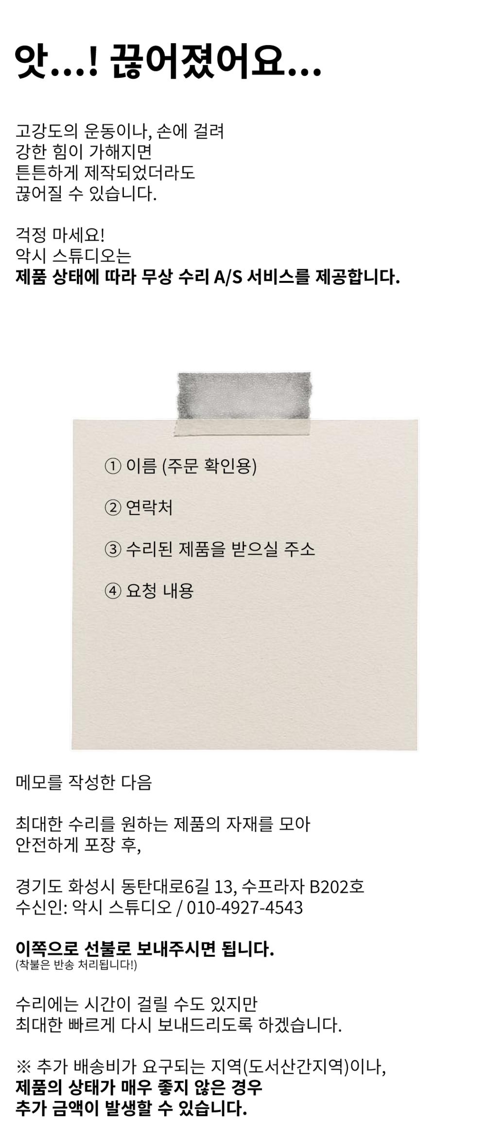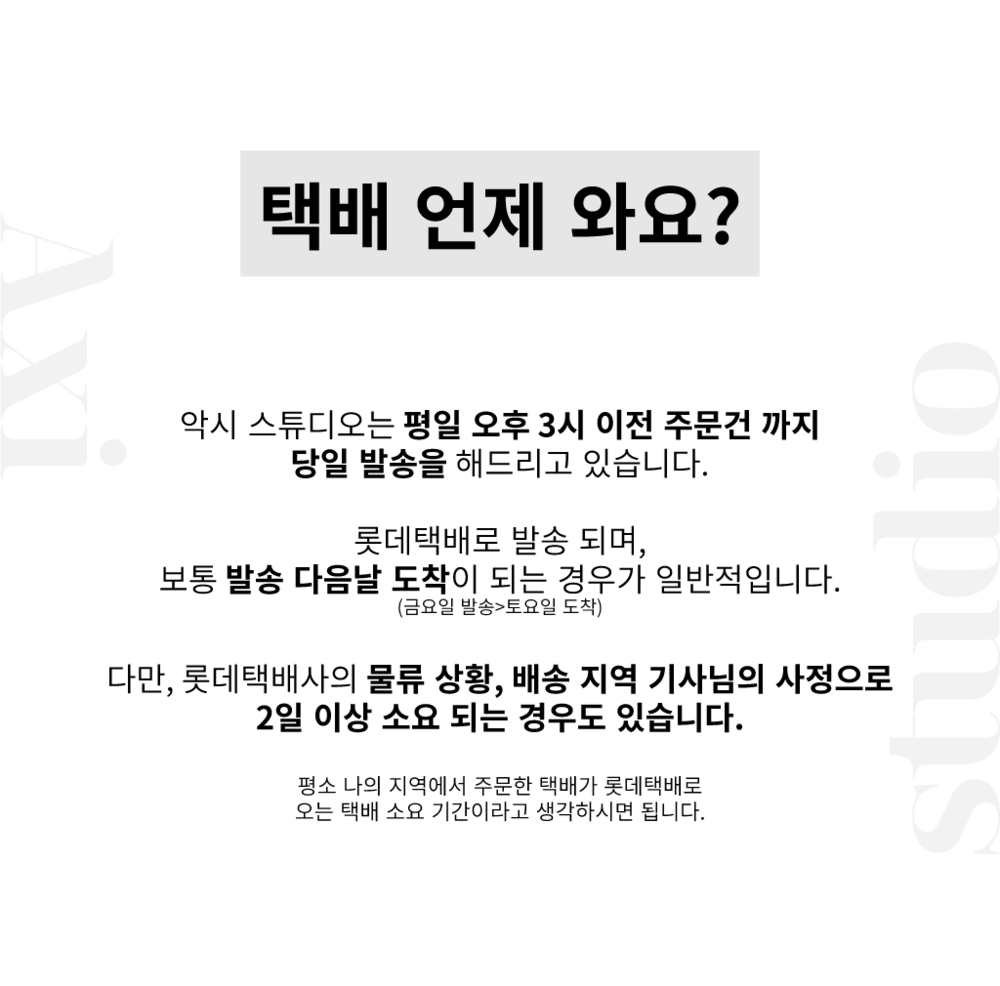※ 제품 하자 및 오배송의 경우, 왕복 배송비는 악시 스튜디오가 전액 부담합니다.※ 단순 변심 교환/반품은 상품 수령일 기준 7일 이내 신청이 가능하며, 사용 흔적이 없고 구성품이 온전해야 합니다.