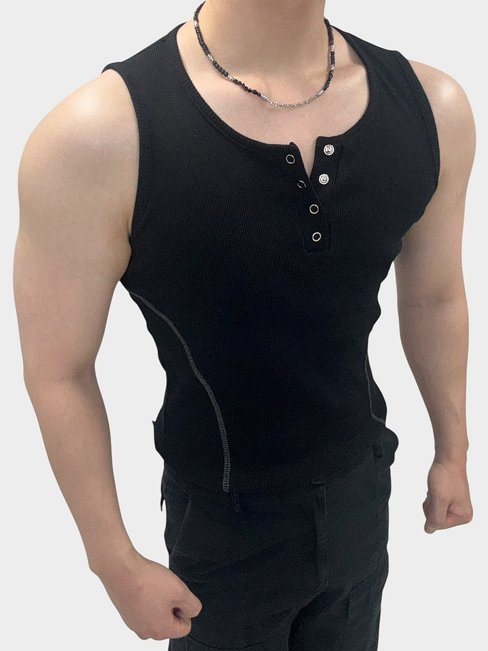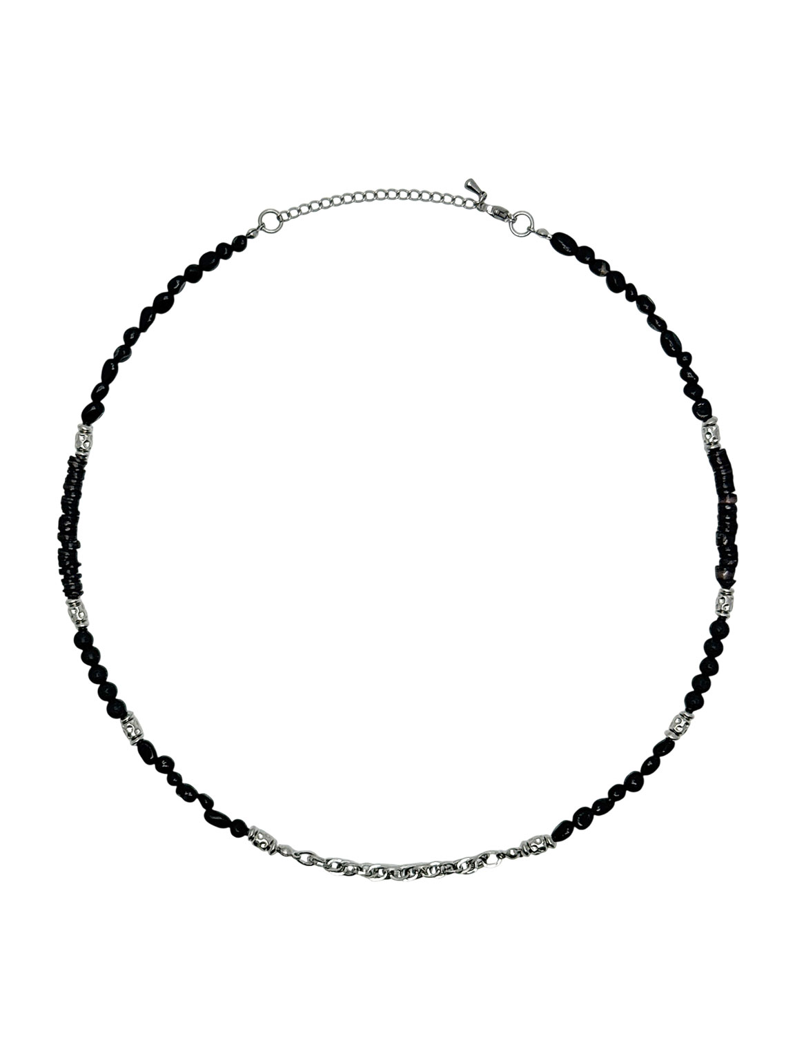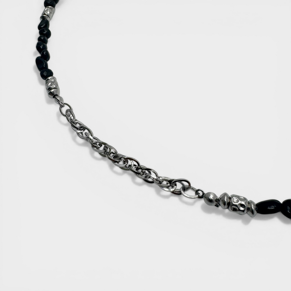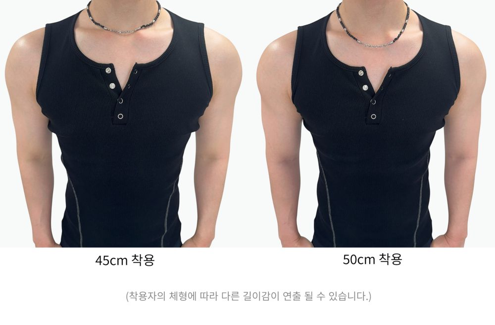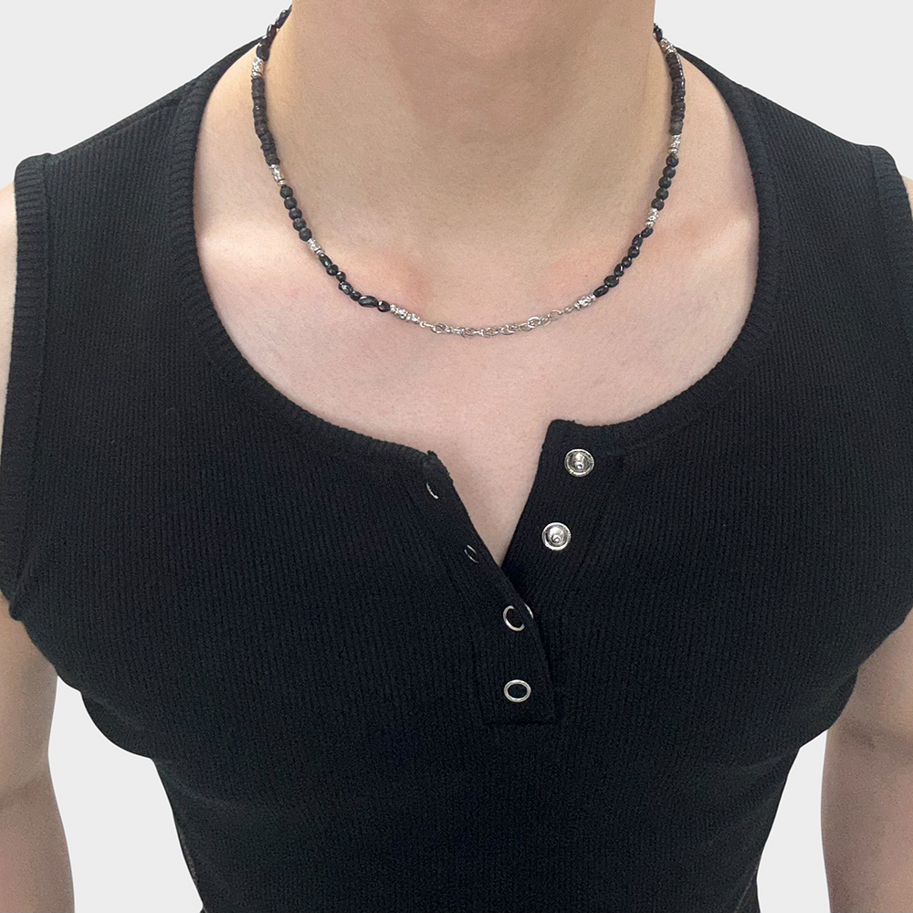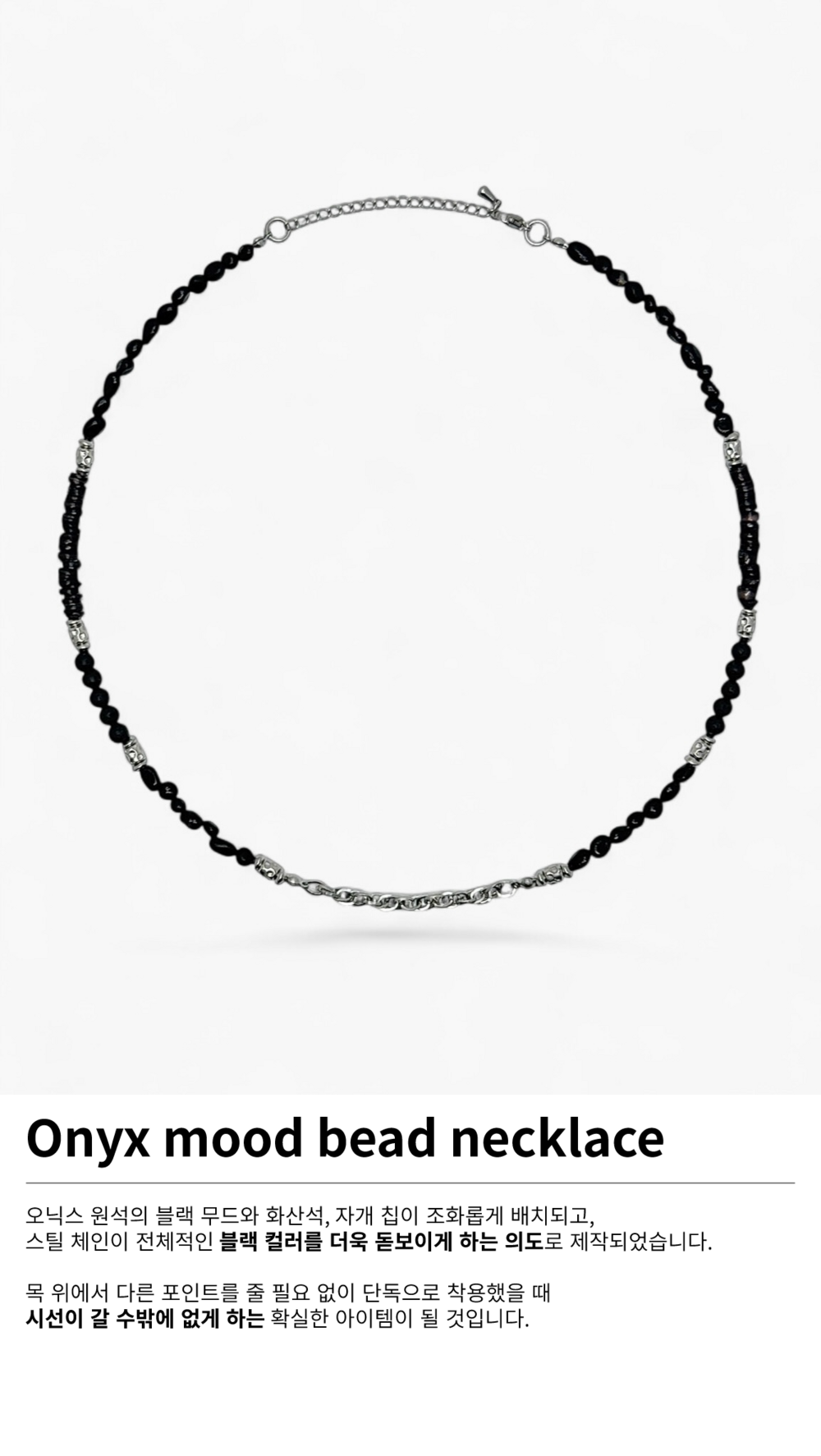 써지컬 스틸 체인이 중심을 잡아 블랙 무드를 더 돋보이게 해줍니다.
