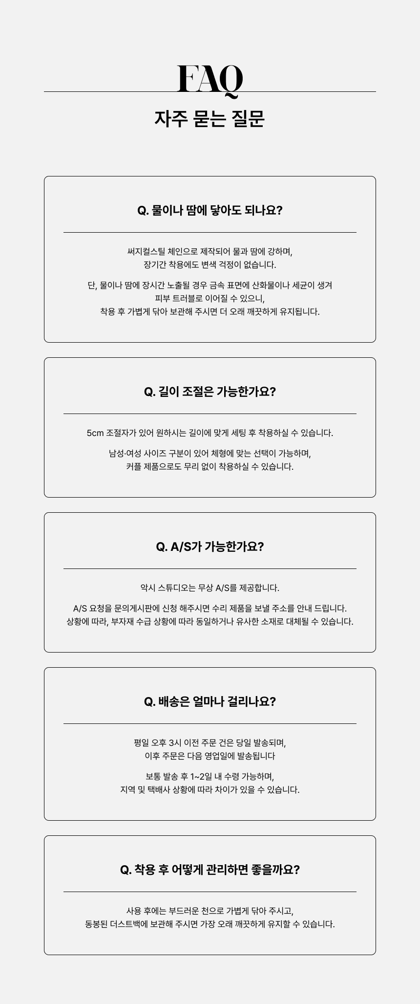 체인 제품은 구조상 꺾이거나 끊어질 수 있으니, 착용 시 부드럽게 다뤄주시길 바랍니다.